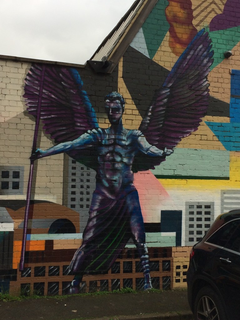I also enjoyed the readings, there was a lot of spoken word and rap sound in it, making frequently use of rhyme. More than half of the line-up were debuts, a young woman had created her own congratulation poem for her 17th birthday, a man had just found the last line to a poem after searching for it for decades. Alison Manning read ‘Poets’ Hour at Aldi’ and ‘Anarchy Bridge’ which I appreciated very much. Andrea Mbarushimana recited a poem about an old bomber pilot whom she had interviewed once. I had nice talks afterwards and got good feedback for my presentation, and when I walked to Earlsdon via Spencer Park, I suddenly recognised the wet carpark next to Aldi below me. I was standing on ‘anarchy bridge’ as I had just learned.