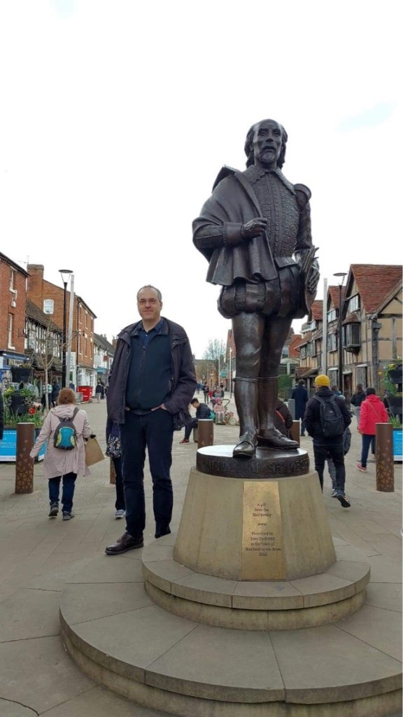In the afternoon, Monika and Nikolai took me to Stratford-upon-Avon—for a certain reason the heart of it all. We were primarily interested in our well-being in a café, but I realised after all that Shakespeare’s shoes had a bigger size than mine although I’m trying to keep pace. We also visited the church where he is buried, having a little stroll along the riverbank of the Avon, and from the theatre’s lookout tower we saw the Cotswold Hills in Gloucestershire in the distance. We were having an ice cream when it started raining again.