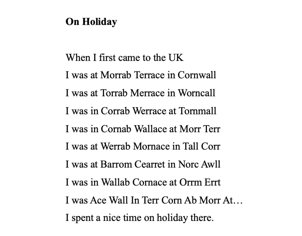 In the evening, Monika and I were invited to the regular meeting of Coventry Writers’ Group. There I saw Ann again, the poet who came to Dresden in 2023, and met Navkiran who is supposed to be the next exchange poet in September 2024. We were very warmly welcomed by Margaret and since I knew that the evening’s writing theme would be ‘Fool’, I had myself written a little ‘foolish’ poem in ‘pseudo-English’ on this occasion when I was on the plane: