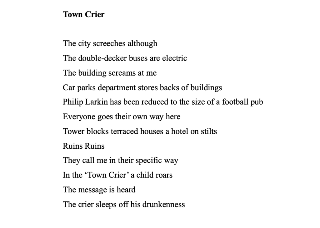 Ausrufer, Plärrer, Marktschreier would be words for a town crier in old German cities. And aren’t writers, poets, Poet Laureates in particular, to be considered as the silent town criers of our times, telling people the truth? When I went past a little theatre, I recognised a poster in the window, ‘This Poem Is For You’ by Andrea Mbarushimana. ‘I hope you have a good day’, it said to me. And this is what I mean. Writers usually don’t have loud voices. Their efforts are often located in the demolition zone. But there will be always something left. The message is heard. That’s worth it.