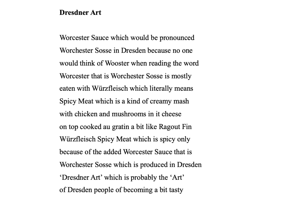 The mysteries of English spelling and correct pronunciation at least caused a good laugh. Since I had wisely taken a small bottle of Worcester Sauce ‘Dresdner Art’ for demonstration purposes with me, Ann gladly agreed to take it as a present and promised to give me ‘an original one’ in return.