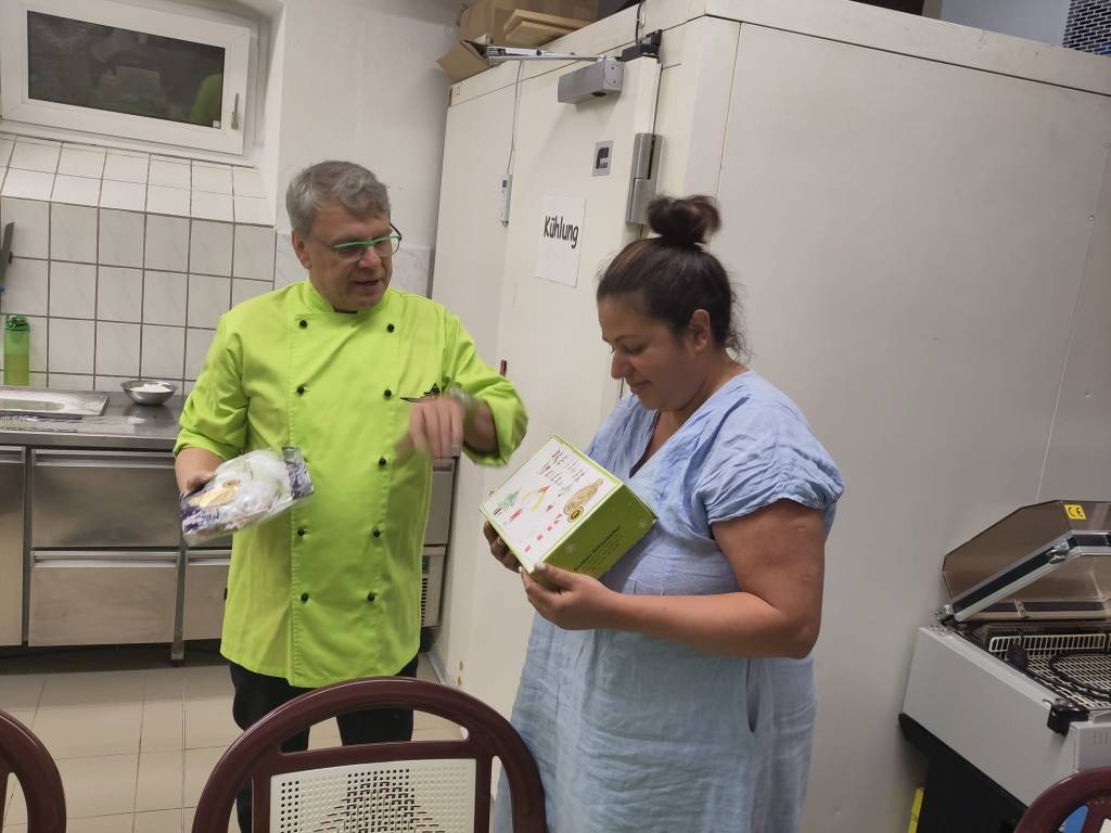 Master Baker Rüdiger Zopp gave me a specially designed stollen to take home. The artwork on the box is by local school children which is wonderful. I gave this to Monika Campbell and Nikolai Press, Coventry, UK Event Organisers, Coventry Dresden Exchange. German Liaison, Coventry Association for International Friendship (CAIF). They are planning to share the stollen with the various groups in Coventry which I am sure they will enjoy this Christmas.