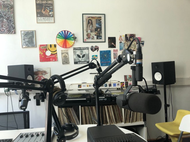 After an excellent session, suddenly it was time to skip lightly across Neustadt’s funky streets to pitch up at Coloradio, a local community radio station to meet ‘Olaf’ our radio presenter for a two hour interview about all things poetry, music and how these two arts overlap and enhance one another. Olaf asked piercing questions with serious blue eyes that twinkled just a little. I gave as generously as I could but afterwards felt drained and many ‘better’ answers came to my mind. The radio station had a fantastic community feel and I loved sitting in the studio talking over such wide-ranging topics. Dorothee, once again, accomplished a mammoth task of interpreting our interview with Patrick providing excellent support including, reading out one of my rap poems he’d translated – not an easy task, and I was happy with the result.