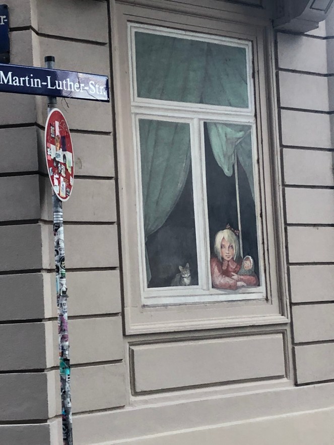 At the end, we hopped a trusty bus and met up with Ann and Tracy at Katie’s Garage in Alaunstrasse for a drink then headed out to find somewhere to eat with Annika and Catherine at the fascinating ‘Raskolnikoff’ restaurant (named after Dostoyevsky’s tall, dark and handsome protagonist in ‘Crime and Punishment) where we feasted on tasty Russian dishes – I had the Pelmeni Linsen or Russian dumplings in a delicious sauce. For a moment I felt deep exhaustion and had a compelling impulse to curl up on my bench in the restaurant for a cat nap.