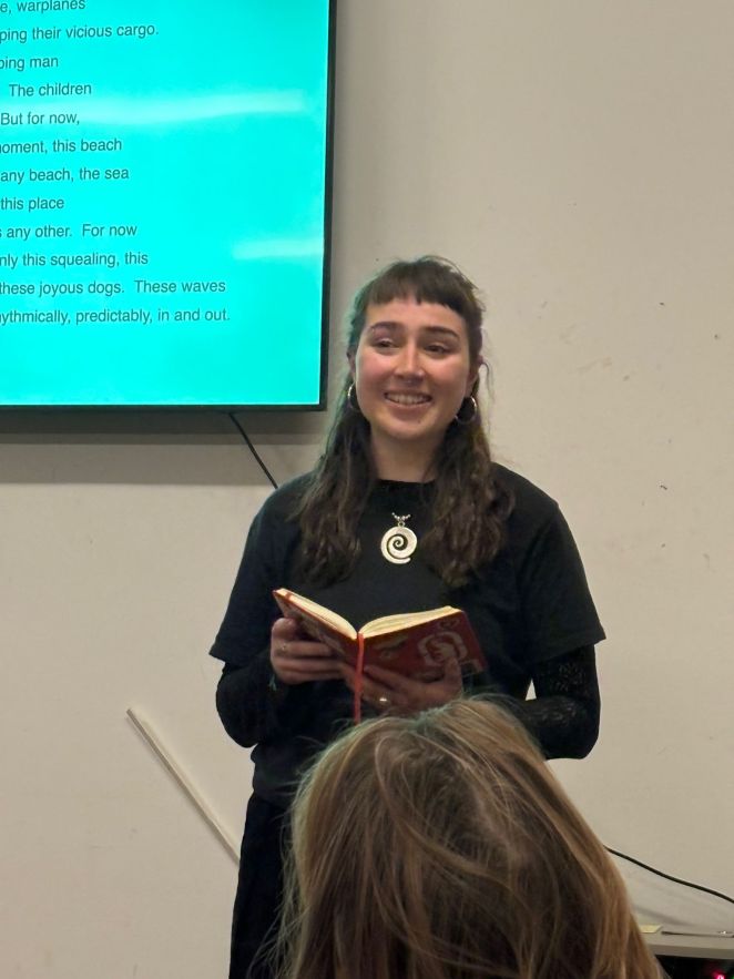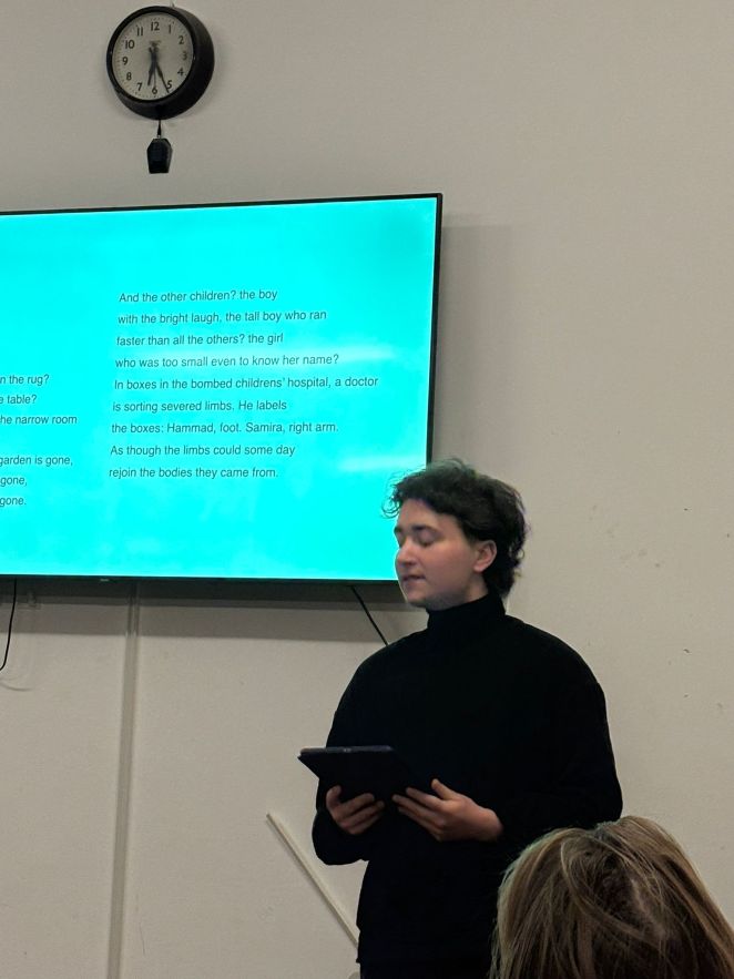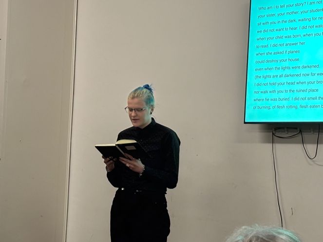 We were very pleased to welcome Marc Lalonde (Lektor) and students from ‘The Tudors’ – this is the name of the drama group within the Institute for English and American Studies at the Technische Universität in our partner city of Dresden. This was the group’s fourth visit and this time around they were reading ‘Poems for Gaza’. The readings were from Anita Barrows, a US poet, who was, and continues to be, shaken by events in Gaza and has written a poem a day, bearing witness to the humanitarian crisis as it has unfolded over 873 days (by today’s date) (see https://www.poemsforgaza.com).